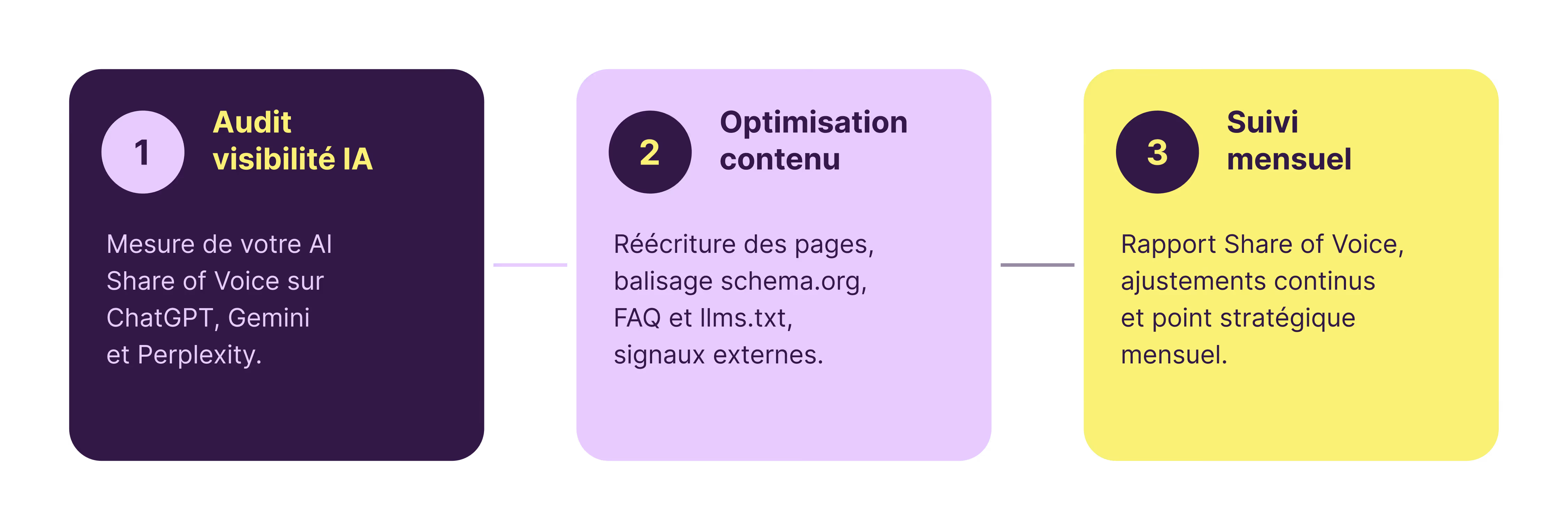 Nous avons conçu une offre GEO en trois étapes, applicable indépendamment de votre secteur et de la maturité de votre présence digitale actuelle.