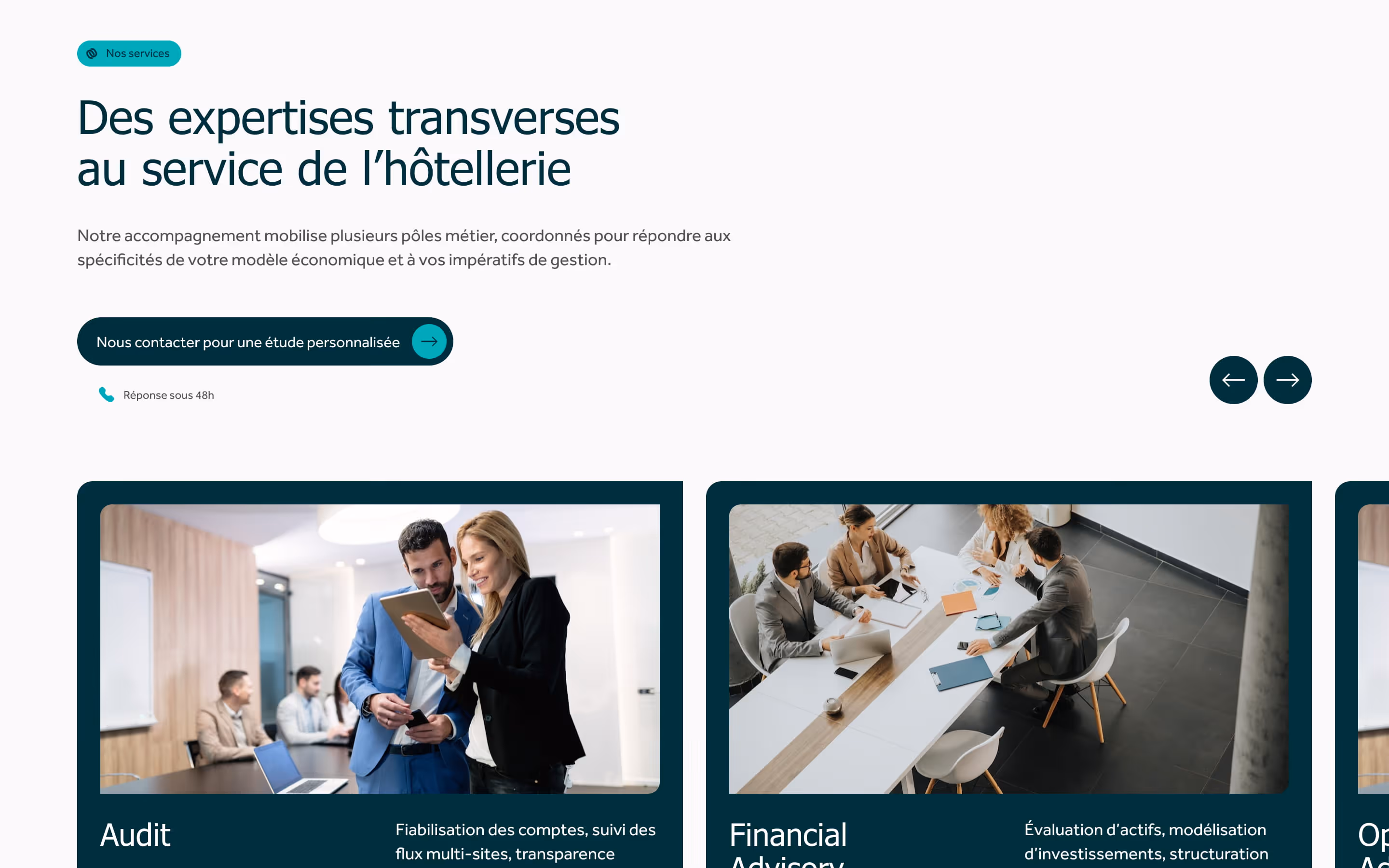 - Architecture de l'offre : Structuration du site autour de pôles d'expertises clairs et de pages services détaillées.