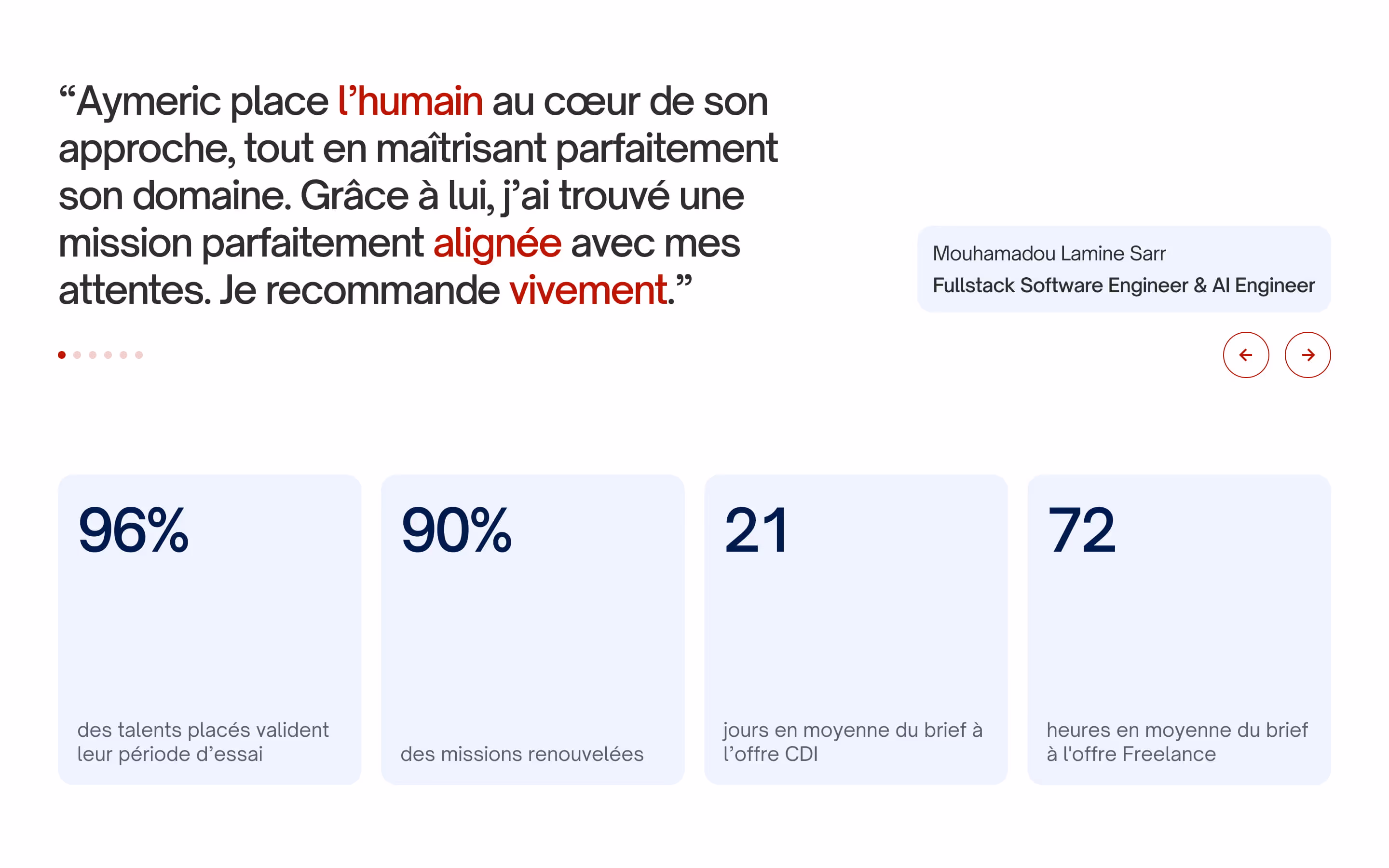 Clear structuring of services: permanent recruitment, freelance, tailor-made support and post-recruitment follow-up.