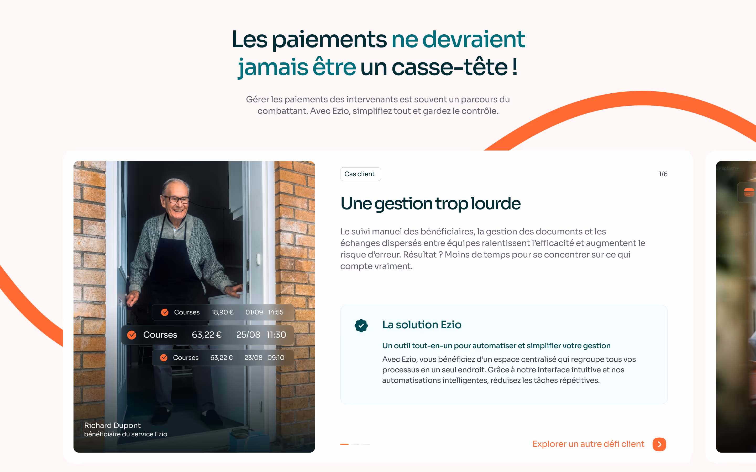 Parcours fluide, pédagogique, orienté compréhension rapide. Chaque page répond à une question clé : à qui s’adresse Ezio, quel problème est résolu, et pourquoi c’est sécurisé.